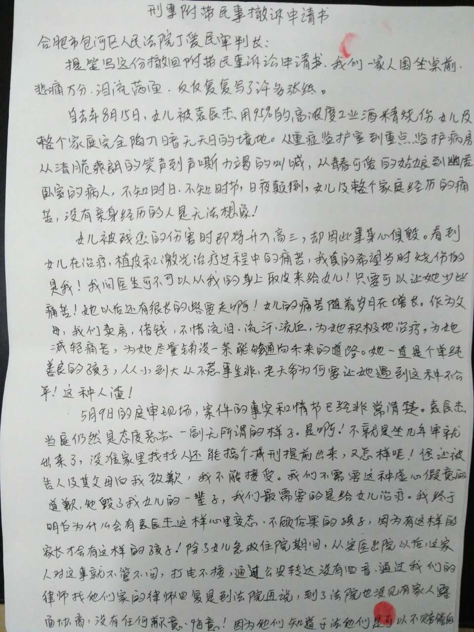 5月9日在包河区法院开庭的“合肥28中17岁少女被酒精毁容案”,鉴于开庭时被告人袁辰杰的态度和庭后袁辰杰父母的态度,受害人及家人再受打击,决定撤回附带民事诉讼。于5月18日和5月19日两次前往法院递交撤诉申请书均未见到法官,遂于5月19日快递寄送。经查询,快递已于当日下午6时24分由包河区人民法院签收。同日,申请书也已递交至包河区人民检察院。