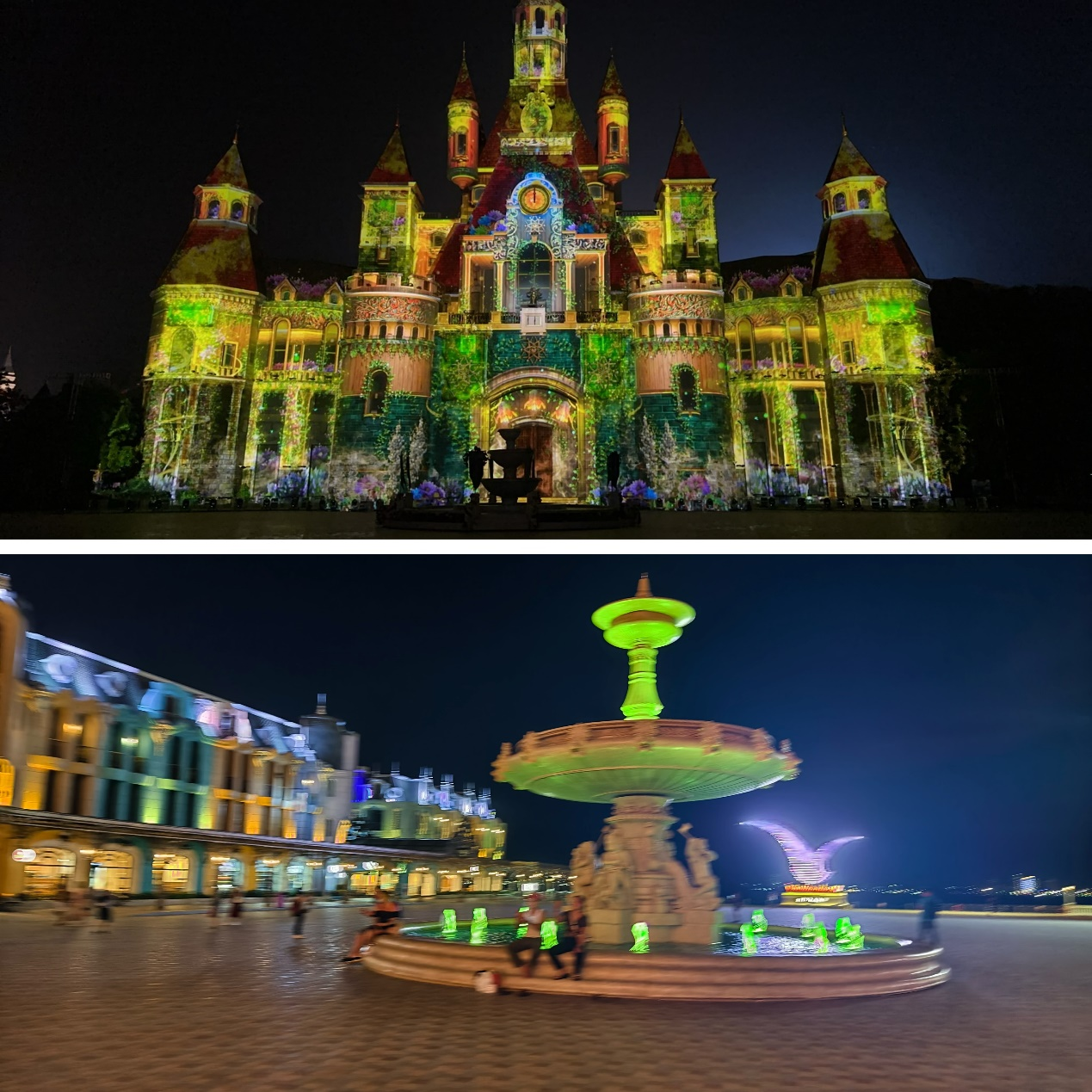 欣赏珍珠岛音乐喷泉,喷泉水随着音乐的节奏在五彩灯光的照射下,忽高忽低的,音乐激烈时,犹如天女散花似的从天而降,恰似一枚枚火箭,喷着白烟腾空而起,又如仙女下凡,将一篮篮似烟似雾的花瓣撒向人群。音乐缓慢舒缓时,喷泉水像一朵朵盛开的花儿, 又像一叶轻舟在碧波荡漾的海面上随波逐流。