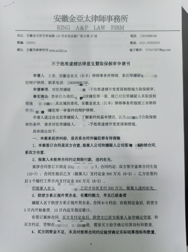 本案中,受害人报警称,其在国际大宗货物贸易中和嫌疑人签订合同,支付300万元货款被骗,办案机关刑事立案,并对嫌疑人采取刑事拘留强制措施。受害人亲属找到安徽金亚太王非律师。