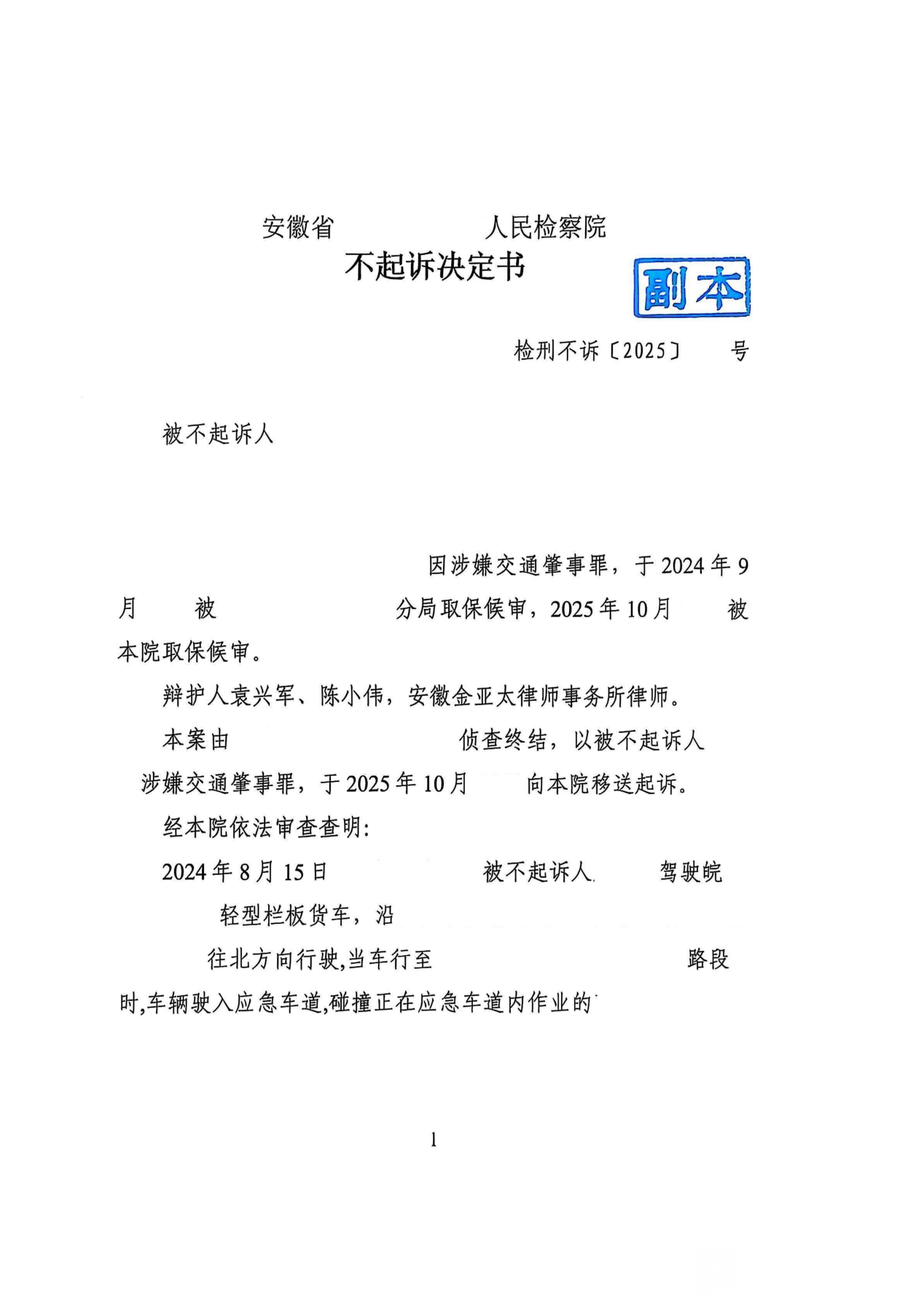 在获得被害人的谅解后,辩护人撰写了不起诉法律意见书:一、林某犯罪情节轻微,根据地方量刑指引,本案基准刑期仅为一至二年,且交通肇事罪属过失犯罪,林某主观恶性显著较低;二、林某具有自首情节;三、林某取得被害人近亲属谅解,目前被害人近亲属已经获得全部赔偿金;四、不起诉林某有利于保护民生,有利于社会和谐与家庭稳定,林某年近六旬,以驾驶小货车运输为唯一生计,若对其提起公诉并判处刑罚,不仅将导致其驾驶证被吊销,丧失谋生手段,使其家庭陷入绝境,亦将因犯罪记录使其再就业极为困难,难以回归社会;五、林某案件没有消耗大量司法资源,当事人一直未被采取羁押措施且主动推进调解,节省了司法资源;六、事故全部责任是林某妥协的结果,被害人擅自在高度危险的高速公路上冒险违章作业,对交通事故的发生有一定责任。为了让被害人的近亲属能够多获得一些赔偿金,林某才自愿承担全部责任。