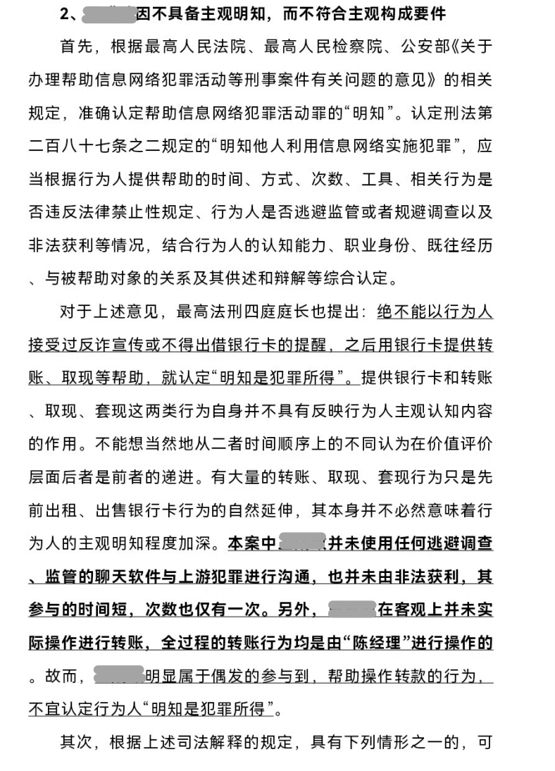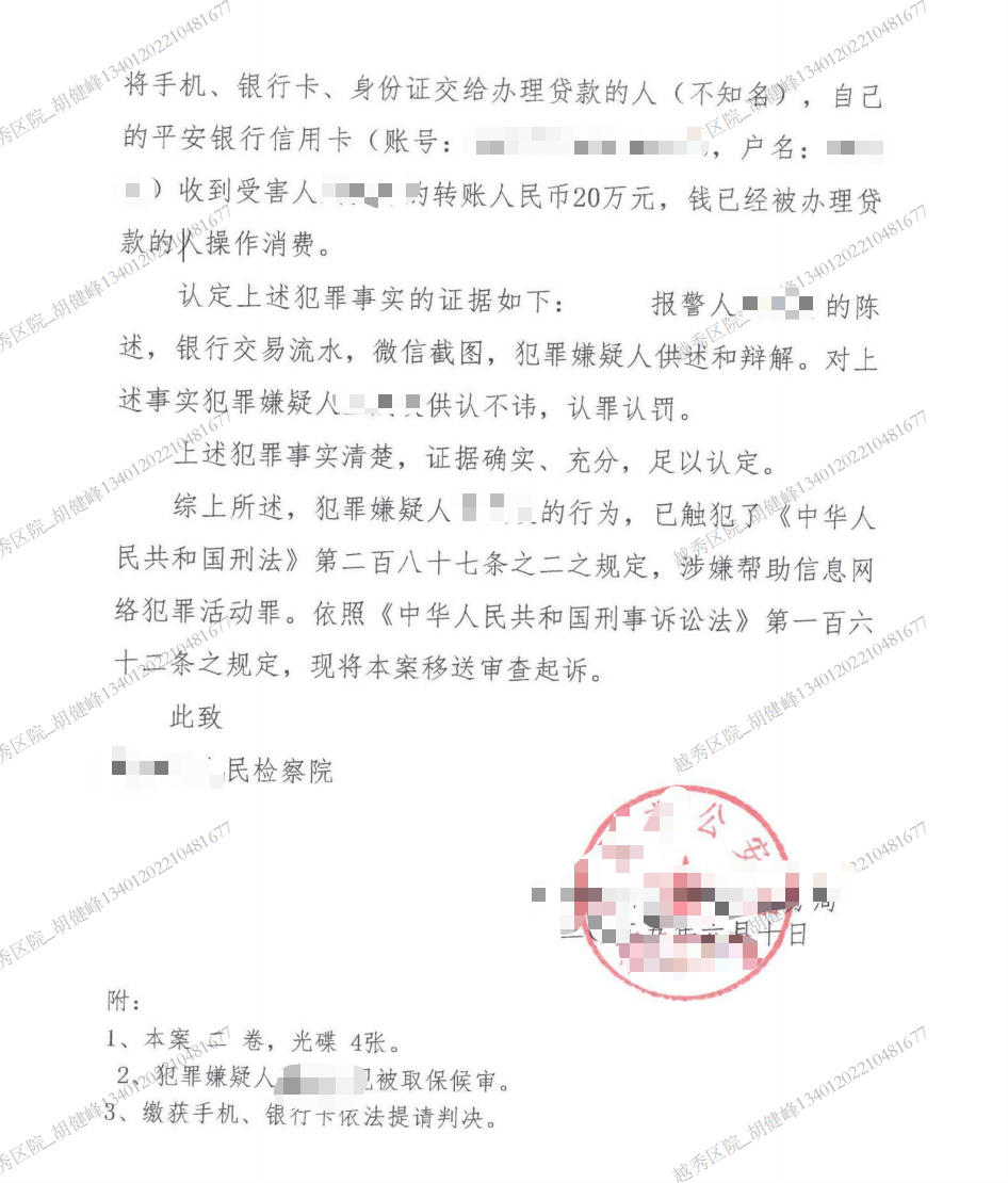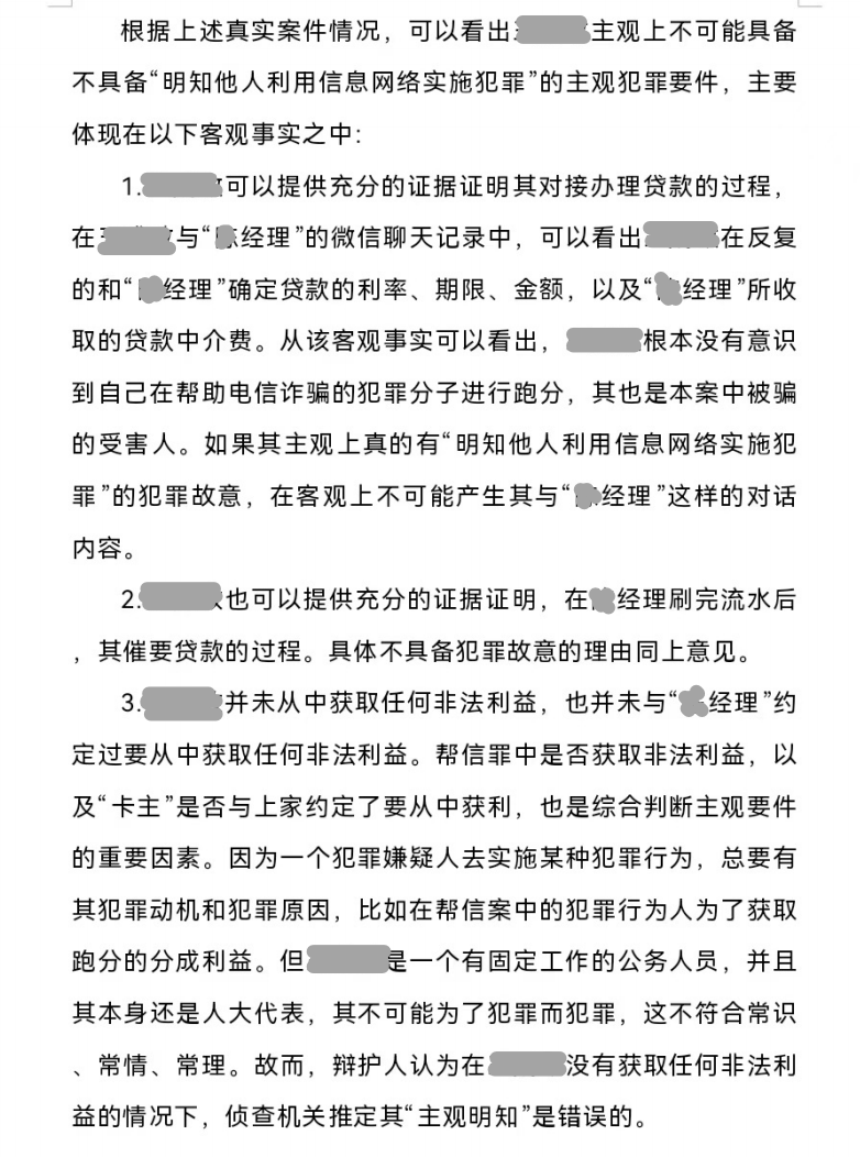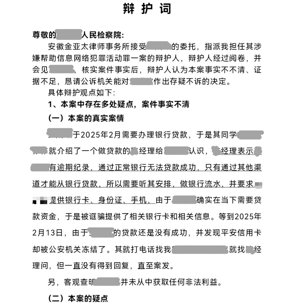 在审查起诉阶段,胡律师围绕“主观明知”和“情节严重”两个核心构成要件展开辩护。通过梳理全案证据,指出W某提供银行卡系基于办理贷款的正当需求,无证据证明其明知他人利用信息网络实施犯罪,且涉案资金流水单一,未达到“情节严重”的入罪标准。胡律师向检察院提交了法律意见书、类案检索报告及数百页的证据材料,形成了完整的无罪辩护体系,其中类案检索报告系统地梳理了全国范围内二十多起类似情节不起诉的案例,强化了辩护观点的实践支撑。