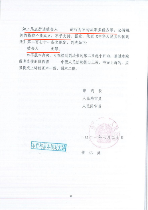 在审判阶段,辩护人向法院提交无罪证据,坚持作无罪辩护。经过开庭审理,合议庭认为沈某某某的行为不构成职务侵占罪,协商检察机关撤回起诉,但是检察机关不同意,鉴于法检两家意见无法达成共识,本案一直延期审理。在当事人的坚持和辩护人的努力下,法院最终采纳无罪辩护意见,判决沈某某无罪。