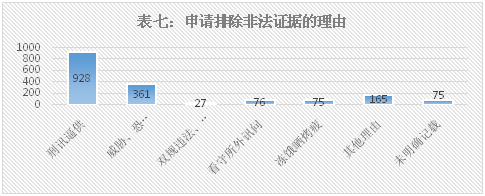 在申请排除非法证据的理由中,以刑讯逼供作为理由提出的申请928件;以威胁、引诱、欺骗为由提出申请的361件;涉及冻、饿、晒、烤、疲劳审讯的75件;以看守所外讯问违法为由提出申请的76件;以双规违法、纪委违法讯问为由提出申请的27件;以其他理由申请排除非法证据的165件,这些理由出现的频率往往以3-5次为限,具体包括例如“未提供眼镜阅读笔录”、“讯问主体不合格”、“讯问有不当之处”、“搜查时见证人未实际到场”、“笔录未经核对”、“被同监犯人罚站、监管不合法”、“未同步录音录像”、“在办案区执行监视居住违法”等;另外还有75个案件申请排除非法证据的理由在判决书中未明确记载。