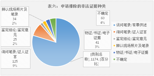在全部非法证据排除申请中,有1174个申请是针对讯问笔录、有罪供述,此类申请在全部申请中占80.47%。针对询问证人笔录或者证人证言的申请有125个,占8.57%;排除鉴定结论和鉴定意见的申请25个,占1.71%;排除现场辨认笔录及照片的申请34个,占2.33%;排除物证、书证、电子证据的41个,占2.81%。还有60个案件中被告人申请排除的证据不确定,主要是由于被告人申请排除的是立案之前或案件进入侦查程序之前的所有证据,这类案件也占4.11%。