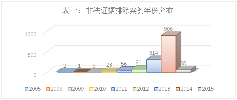 从表一数据来看,2013年、2014年非法证据排除的案例比2012年显骤增加;2011年比2010年的数据也显骤增加(143.48%),但是增加幅度远远不及2013年相比2012年的增幅(287.65%)。