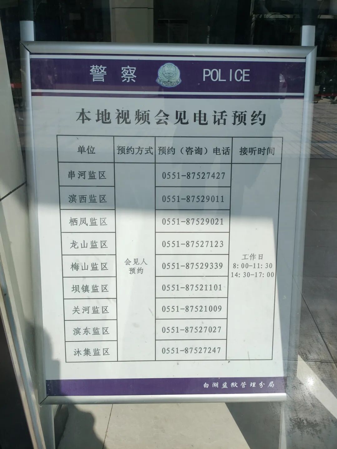 5、由于疫情防控需要,所需要的手续要求可能变化,建议前往会见之前电话进行电话确认,狱侦科电话:0551-87526469。